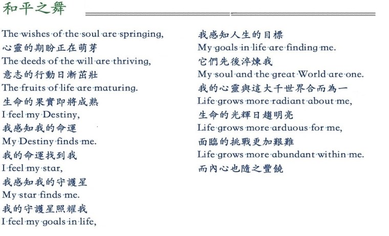 兩年前,在我第一次接觸生命史的時候,張如雅老師送我這首 Rudolf Steiner 施泰納的〈和平之舞〉。當時我並沒有特別的感受及印象,只覺得這首詩很美 。兩年後的今天,當如雅再次分享這首詩時,我立即熱淚盈眶,百感交集 。經過這三年生命的淬煉及洗禮,此時的我,更能欣賞及體會這首詩的深意 ——句句扣我心弦 。